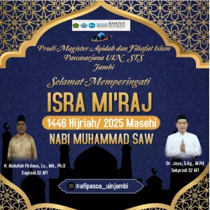 Jambi, 27 Januari 2025 — Program Studi Magister Aqidah dan Filsafat Islam (AFI) Pascasarjana Universitas Islam Negeri Sultan Thaha Saifuddin (UIN STS) Jambi mengucapkan Selamat Memperingati Isra Mi’raj Nabi Muhammad SAW, yang jatuh pada 27 Rajab 1446 H / 27 Januari 2025 M.