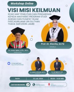 Prodi Magister Aqidah dan Filsafat Islam (AFI) Pascasarjana Universitas Islam Negeri Sulthan Thaha Saifuddin (UIN SUTHA) Jambi sukses menggelar Workshop Online bertajuk “Visi Misi Keilmuan, Roadmap Penelitian, dan Pengabdian Kepada Masyarakat (PKM)” pada tanggal 22 Juli 2024. Kegiatan ini menghadirkan Dr. Imam Iqbal, S.Fil.I., M.S.I., sebagai narasumber utama yang memberikan pemaparan mendalam terkait strategi pengembangan akademik dan penelitian di lingkungan Prodi Magister AFI.